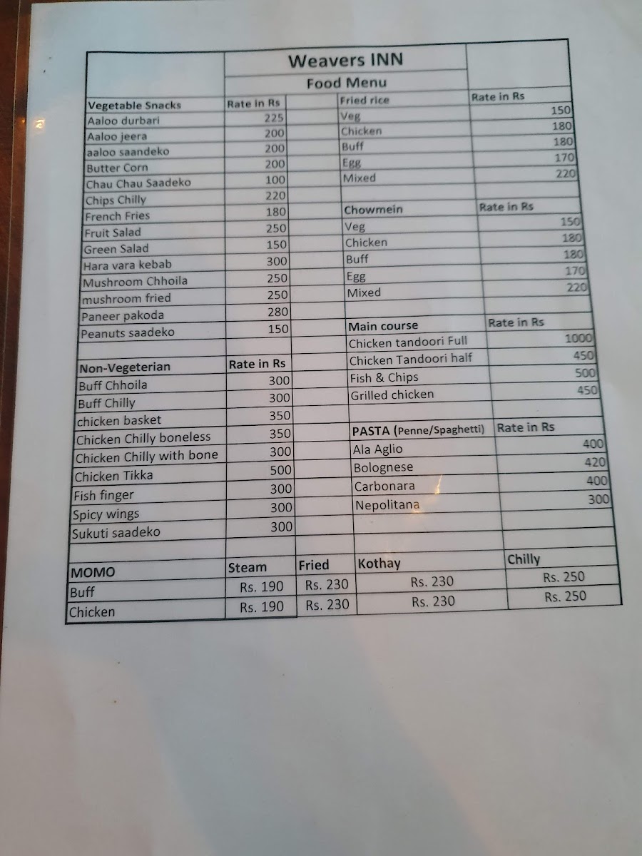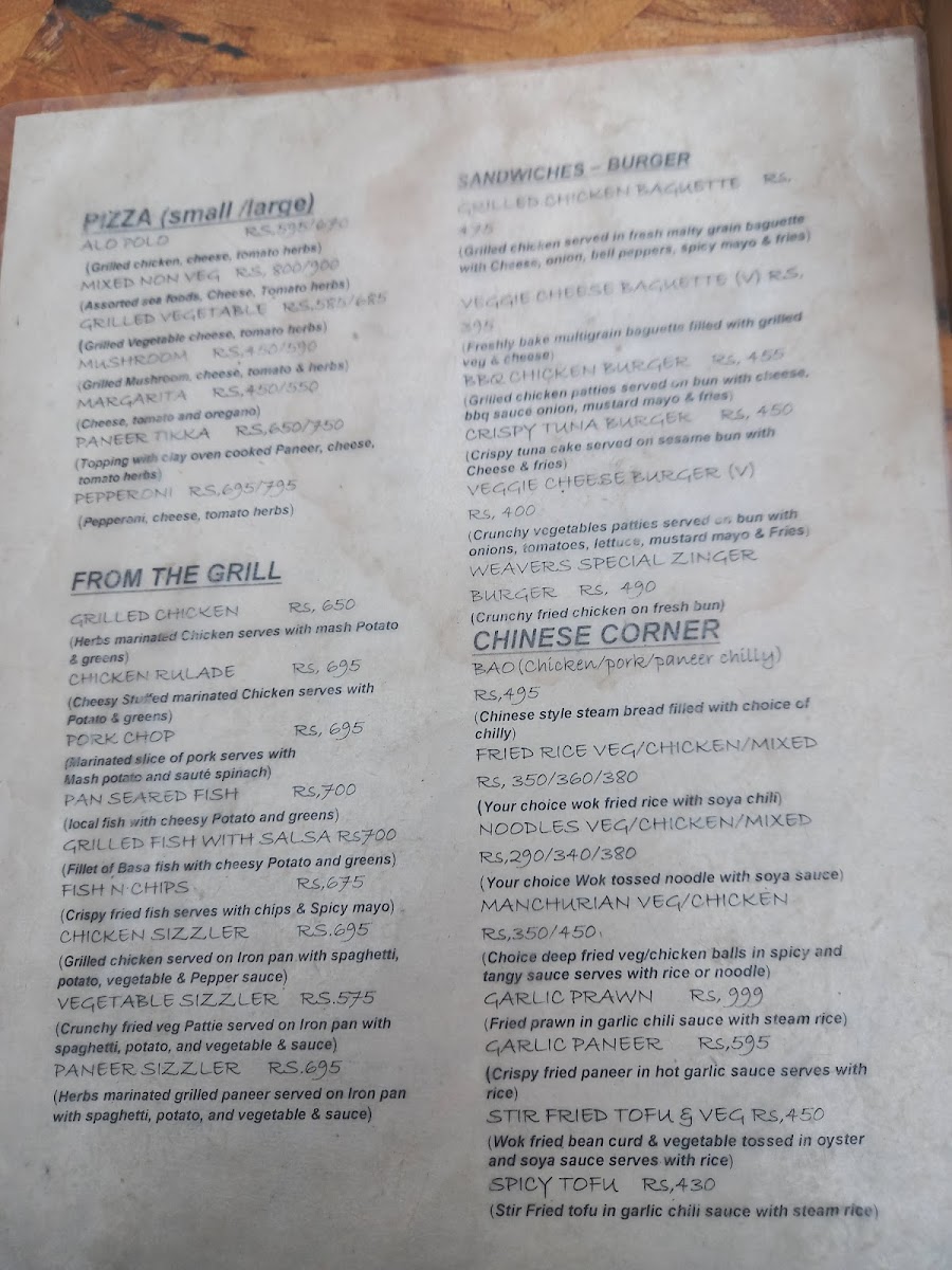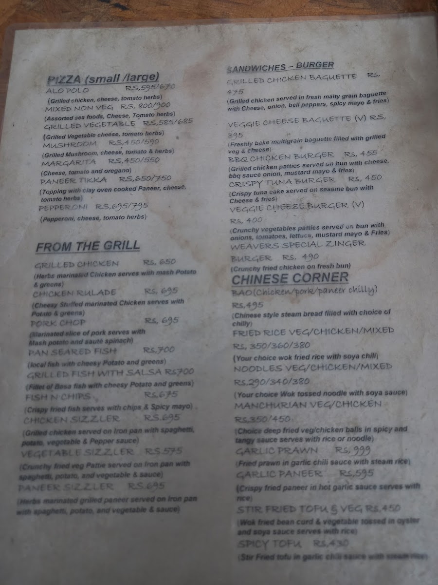 Weavers Inn Menu